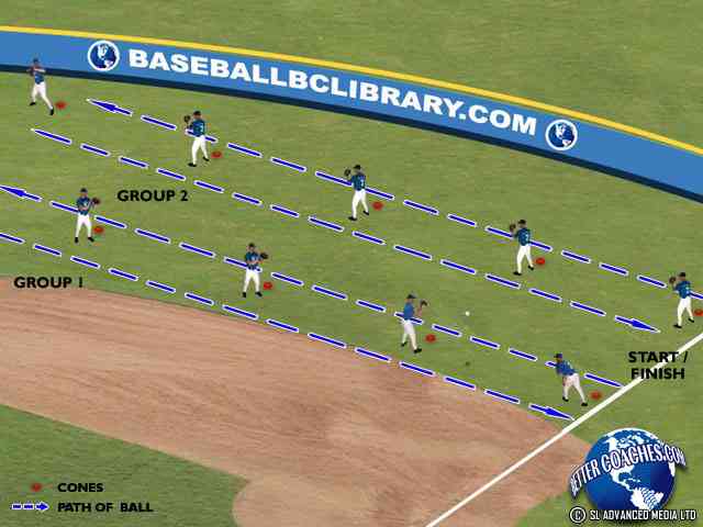Player receives the ball, circles hands, transfers the ball from the glove to throwing hand and releases to the next player in line as quickly as possible.